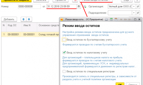 Если такой записи нет, введите ее, обращая внимание на то, что запись вводится строго последним днем применения ОСНО, а Режим ввода остатков — НУ (рис.3)