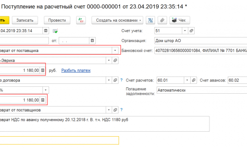 1. Возврат НДС поставщиком оформите документом Поступление на расчетный счет:
