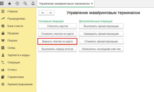 Уточнила — банковский терминал подключен автономно. В программе никак операцию по оплате и возврату по терминалу не проводились.