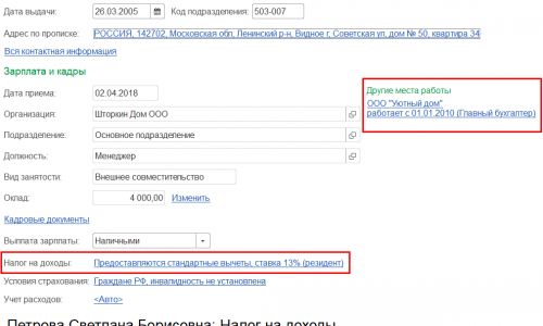 А так же карточку сотрудника в организации, где сотрудник работает по совместительству. Смотрите скрин.