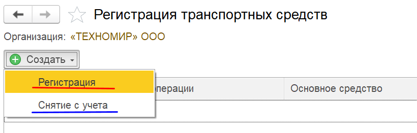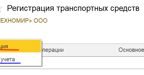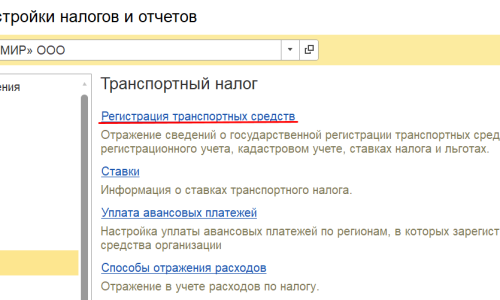 Запись о регистрации и снятии с учета ТС для расчета транспортного налога осуществляется в форме Регистрация транспортного средства (Главная — Налоги и отчеты — Транспортный налог — Регистрация транспортных средств).