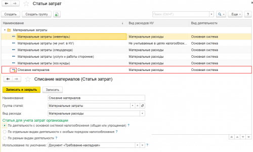 Марина, Статья затрат- Списание материалов создана разработчиками