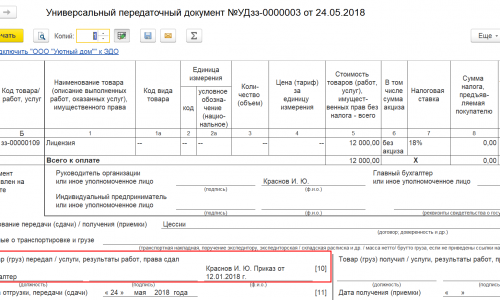 Если счета-фактуры подписывают лица, уполномоченные доверенностью или приказом, в расшифровке подписи надо указывать их Ф.И.О. (Письма Минфина от 14.10.2015 N 03-07-09/58937, от 23.04.2012 N 03-07-09/39). Указывать документ основания в УПД не обязательно. Поэтому в программе не предусмотрен вывод основание на право подписи.