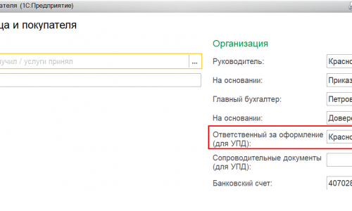 В УПД выводится основания на право подписи в строке Товар (груз) передал/услуги…. , если указан Ответственный за оформление (для УПД).