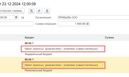 Д 99.01.1 К 68.04.1 ФБ (Налог (взносы): доначислено / уплачено (самостоятельно)