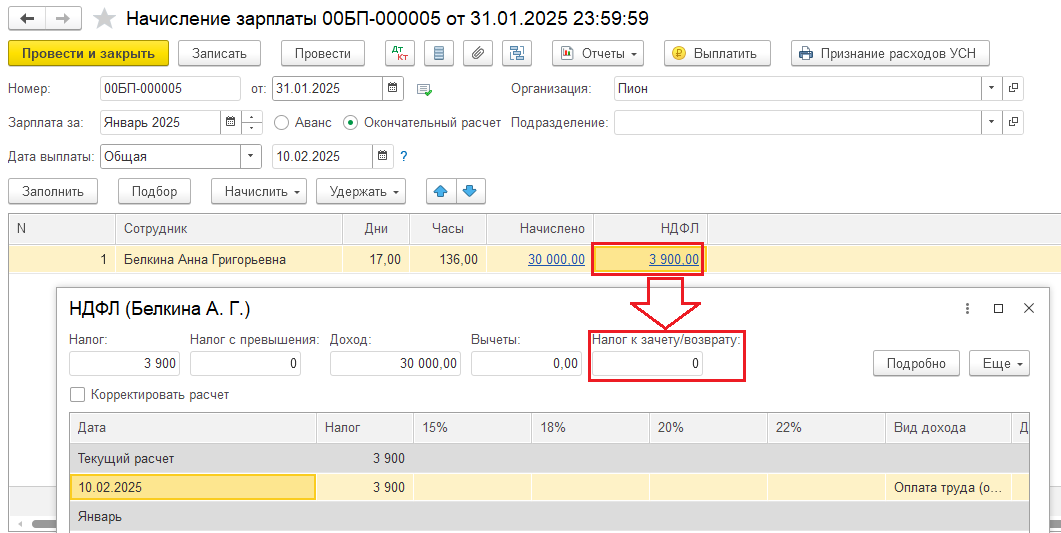 Но в документе Начисление зарплаты тоже есть поле Налог к зачету/возврату, оно доступно для редактирования: