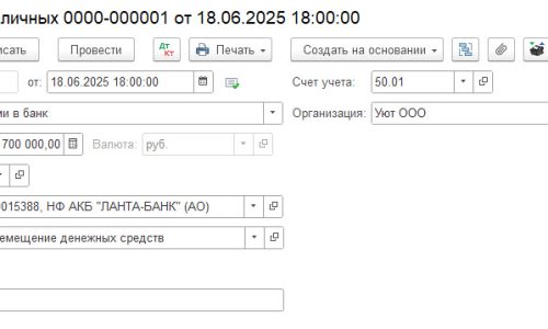 Вид операции — Взнос наличными в банк.