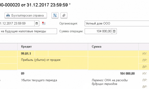 С кредита счета 99 в дебет счета 97 по статье РБП с видом «»Убытки прошлых лет»» на положительную сумму налогового учета и отрицательную сумму временных разниц, равную сумме убытка».