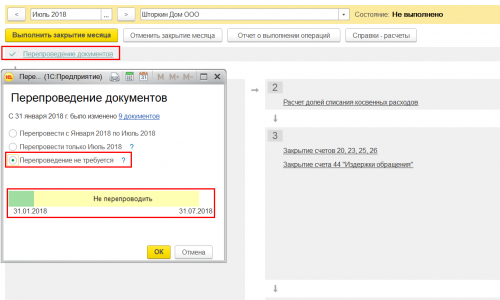 В операции Закрытие месяца нажимаете на операцию Перепроведение документов далее устанавливаете переключатель — Перепроведение не требуется и нажимаете ОК.