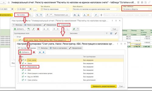 Давайте посмотрим УО по регистру накопления Расчеты по налогам на едином налоговом счете за 1 квартал 2023г.