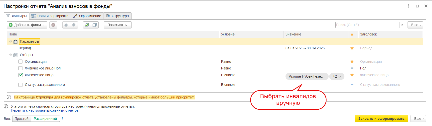 Чтобы вывести в отчет только сотрудников-инвалидов — можно применить отбор на верхнем уровне отчета Физическое лицо в списке. И в список включить инвалидов вручную