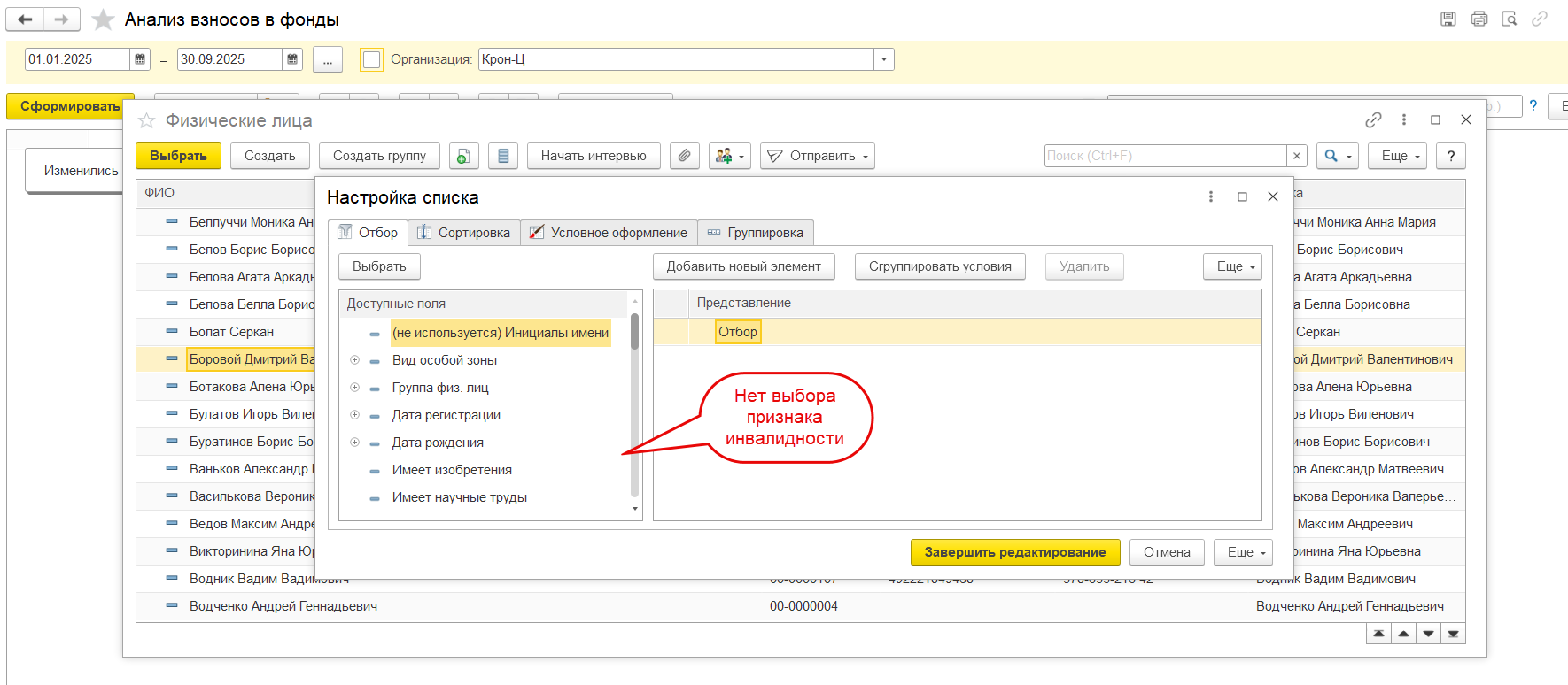 К сожалению, на этапе подбора физлиц из справочника даже нет возможности настроить список по признаку инвалидности — нет такого поля.