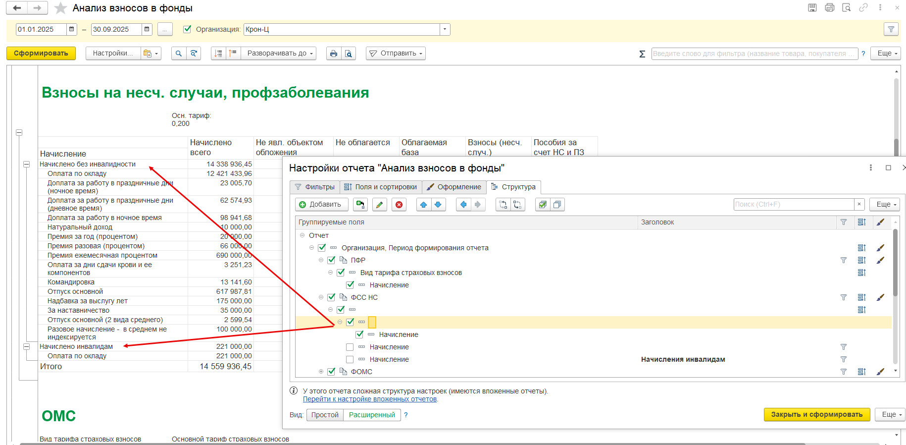 1. Здравствуйте. В отчете Анализ взносов в фонды есть отдельная группировка по начислениям инвалидам и начислениями сотрудникам-неинвалидам, но только для вложенного отчета по взносам на травматизм. Там есть группировка по безымянному полю.