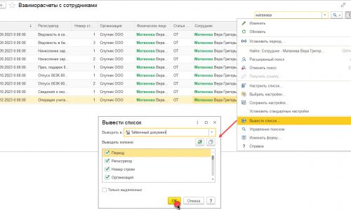 Сделать отбор по сотруднику. Потом меню Еще — Вывести список. Сохранить в формате PDF.