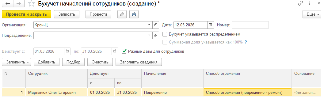 Или в документе Бухучет начислений сотрудников (Зарплата — Бухучет начислений сотрудников) можно настроить способ отражения для определенного периода и сотрудника:
