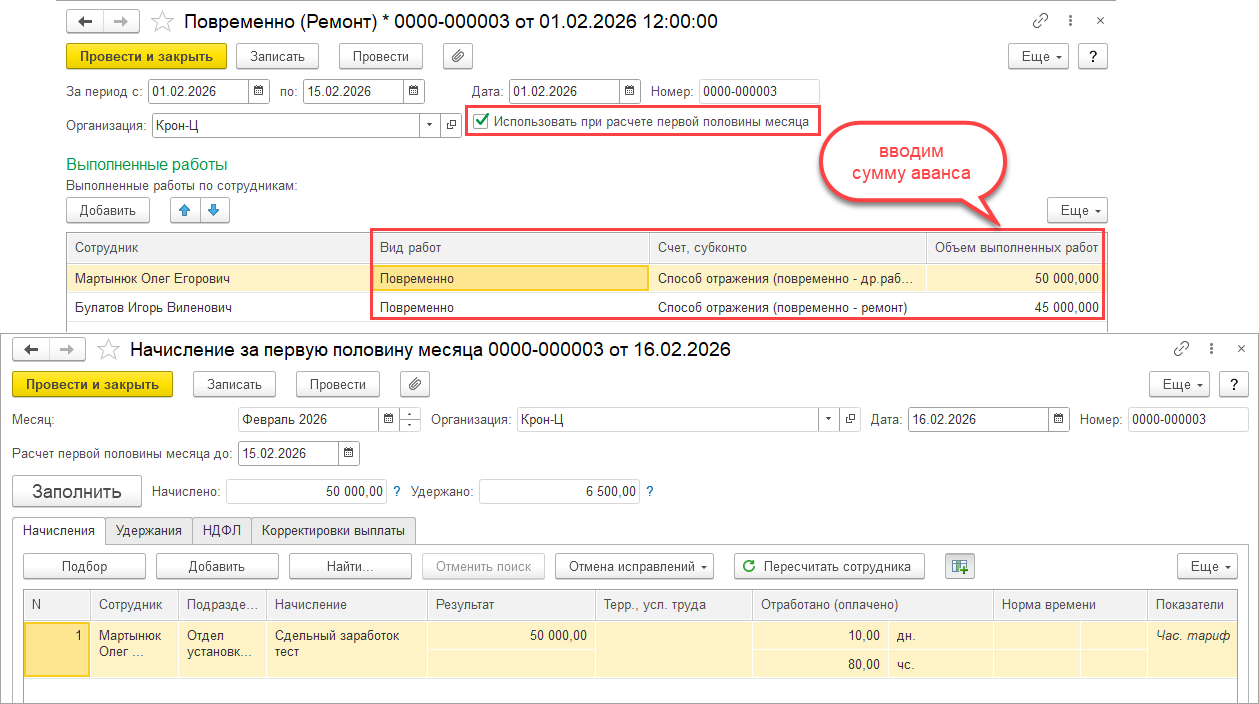 — в результате у нас введенная таким образом сумма повременной оплаты будет начисляться в составе сдельного заработка в первую половину месяца