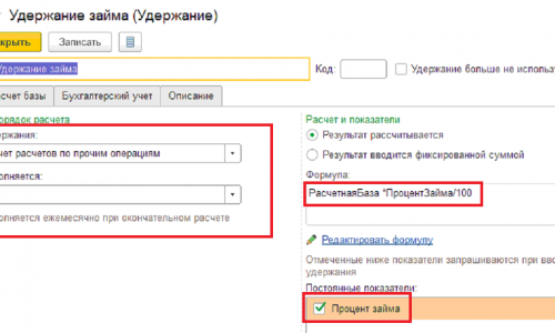 Предлагаю создать новое удержание в разделе Настройка — Удержания, как показано на скриншоте. «Процент займа» — постоянный показатель для сотрудника. На закладке «Расчетная база» необходимо указать начисления сотрудника.