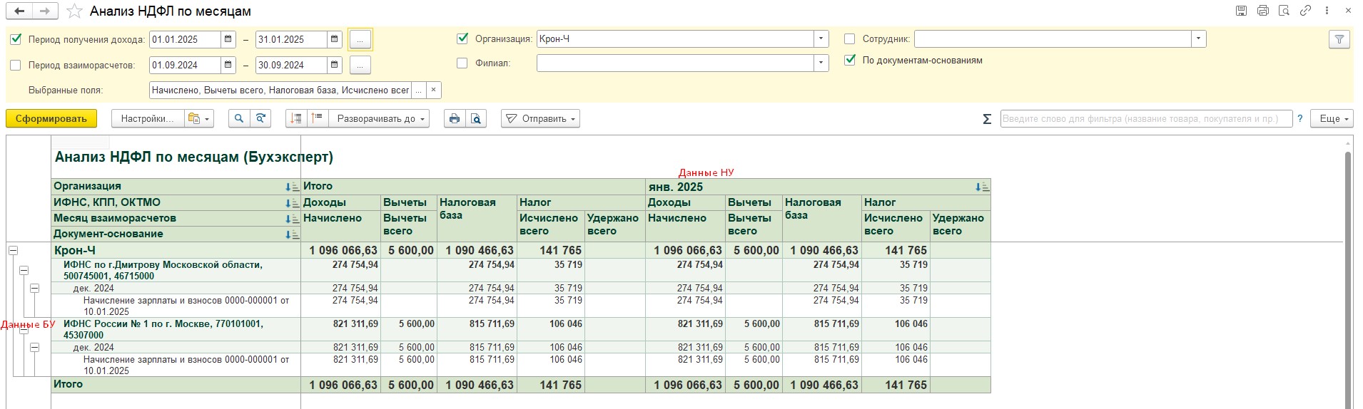 Здравствуйте! В отчетах по БУ мы не можем выделить доходы выплаченные в следующем году, но мы можем взять для сверки донастроенный отчет Анализ НДФЛ по месяцам. В нем суммы доходов, вычетов, НДФЛ, строки сгруппированы по месяцам начисления (БУ), колонки – по месяцам налогового периода (НДФЛ). Скачать настройки отчета можно по ссылке https://buhexpert8.ru/1s-zup/ndfl-i-strahovye-vznosy-1s-zup/ndfl-ischislennyj-uderzhannyj-i-perechislennyj/nastrojki-universalnogo-otcheta-dlya-analiza-ndfl.html#i-16