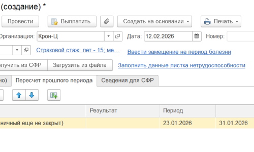 4. В феврале провожу больничный лист с 23.01.2026 по 12.02.2026. На вкладке Пересчет прошлого периода нет сторно РК и СН.