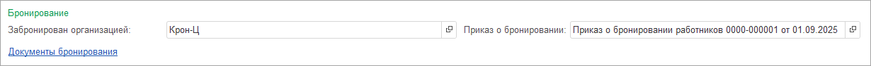 — если создаем Приказ о бронировании работников, то данные о приказе о бронировании в карточке сотрудника отражаются.