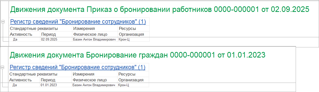 В программе оба документа Приказ о бронировании работников и документ Бронирование сотрудников делают одинаковые записи в РС «Бронирование сотрудников»: