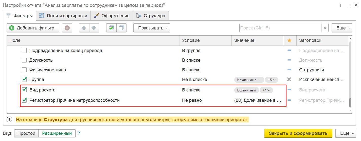 Добрый день! Можно попробовать вывести эти данные в отчете Анализ зарплаты по сотрудникам (в целом за период). В отчете добавляем отбор по виду расчета, укажем условие в списке и добавим значения — Больничный и Больничный за счет работодателя. Если я верно поняла, то нам нужно исключить некоторые причины по нетрудоспособности(например, 06 Протезирование в стационаре или 08 Долечивание в санатории). Для этого можем добавить еще один отбор по полю Регистратор. Причина нетрудоспособности,задаем условие не равно и указываем то значение, которое не должно выводиться в отчете