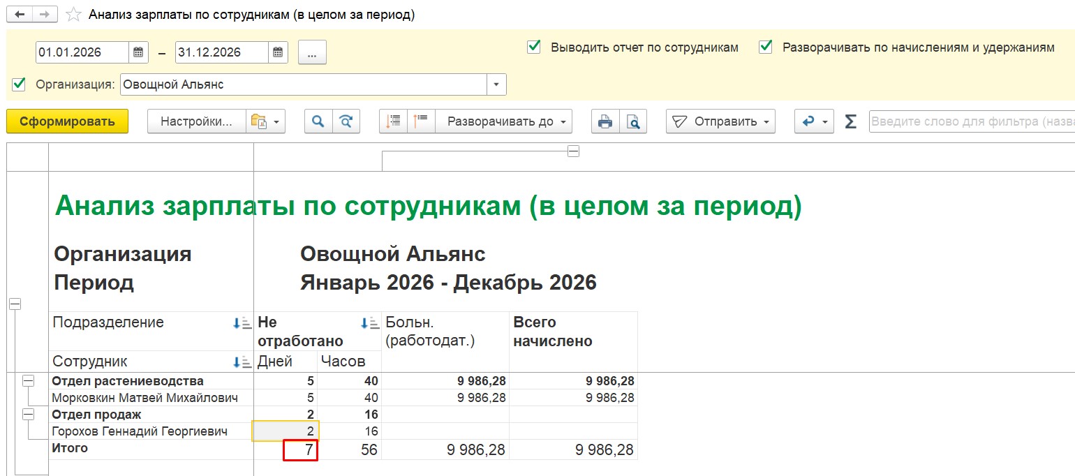 Проверяю с фактическим больничным, там то же 7 (см.скриншот 3), получается в колонку не отработано попадает весь срок больничного.