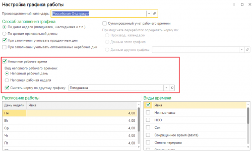Добрый день! Скорее всего в настройках графика не указано, что это график неполного рабочего времени. Пример настройки на скриншотах и в видео — Настройка графиков неполного рабочего времени