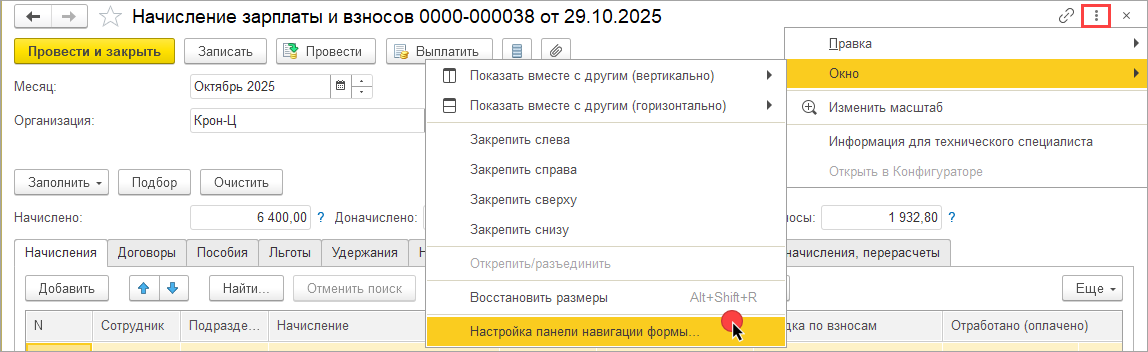 1. В документе по трем точкам справа вверху открываем Окно — Настройка панели навигации формы: