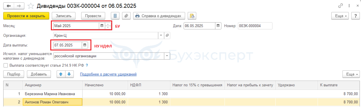 В бухгалтерском учете основанием для начисления дивидендов является решение. Допустим решение оформлено 1.07.25 . Выплата происходит частями. Как данные операции отразить в ЗУП ? Правильно понимаю что в ЗУП начисление дивидендов = уплата, для целей НДФЛ ?