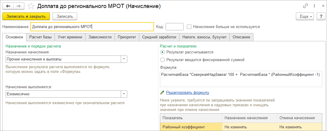 1. Вкладка Основное. Формула: РасчетнаяБаза *СевернаяНадбавка/ 100 + РасчетнаяБаза * (РайонныйКоэффициент -1)