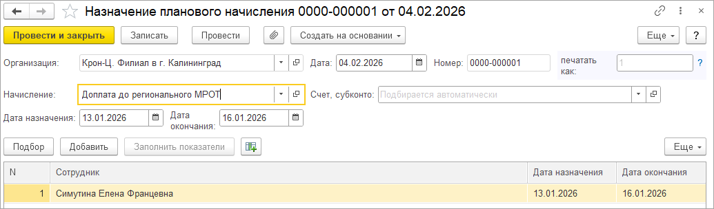 В результате при начислении заплаты будет рассчитываться доплата до регионального МРОТ, например: