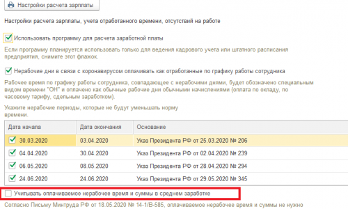 Добрый день. Прочитала на комментарий Минтруда. По его мнению, высказанному в письме от 18.05.2020 № 14-1/В-585, период нерабочих дней согласно Указам Президента РФ от 25.03.2020 № 206, от 02.04.2020 № 239 и от 28.04.2020 № 294 не учитывается при расчете среднего заработка. Наше предприятие непрерывно действующее, и почти все сотрудники работали, но были и те, кто не работал, но заработная плата за ними сохранялась. Для них в табель был введён отдельный код. Если это сотрудник с окладом, то он получал полностью свою ЗП, которую он и так бы получил, если работал. Чтобы исключить из среднего заработка период ЗП за эти дни, что нужно сделать? Вид начисления у сотрудника не поменялся, это нужно было ещё его отдельно делать, аналогичный основному и указывать в настройке, что он в средний заработок не входит или как правильно? И не совсем понимаю нужно ли вообще эти суммы исключать, если по сути у человека ЗП не поменялась.