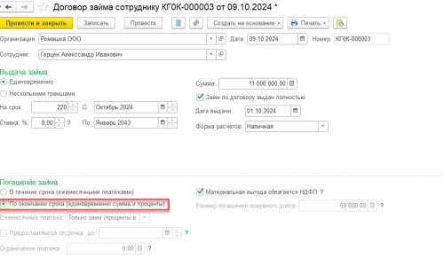 Получается, нам нужно ввести документ Погашение займа. Этот документ сам закроет взаиморасчеты по займу, но также документ зарегистрирует доход в виде материальной выгоды и НДФЛ с нее.
