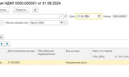 Для того, чтобы пересчитать ндфл введем документ Перерасчет ндфл (Налоги и взносы).
