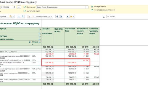 Сформирует отчет Подробный анализ ндфл по сотруднику (Налоги и взносы — Отчеты по налогам и взносам). Проверим, что сторнировался доход по мат выгоде из документа Погашение займа. Проверим расчет ндфл.