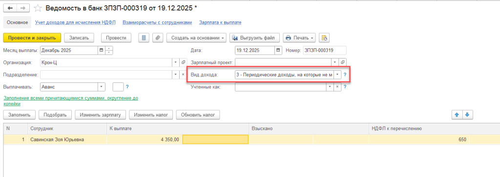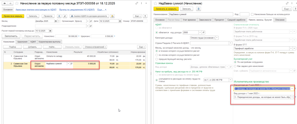 — Часть дохода имеет другой код дохода исполнительного производства – выплатим отдельной ведомостью с нужным кодом дохода (см.скриншот)