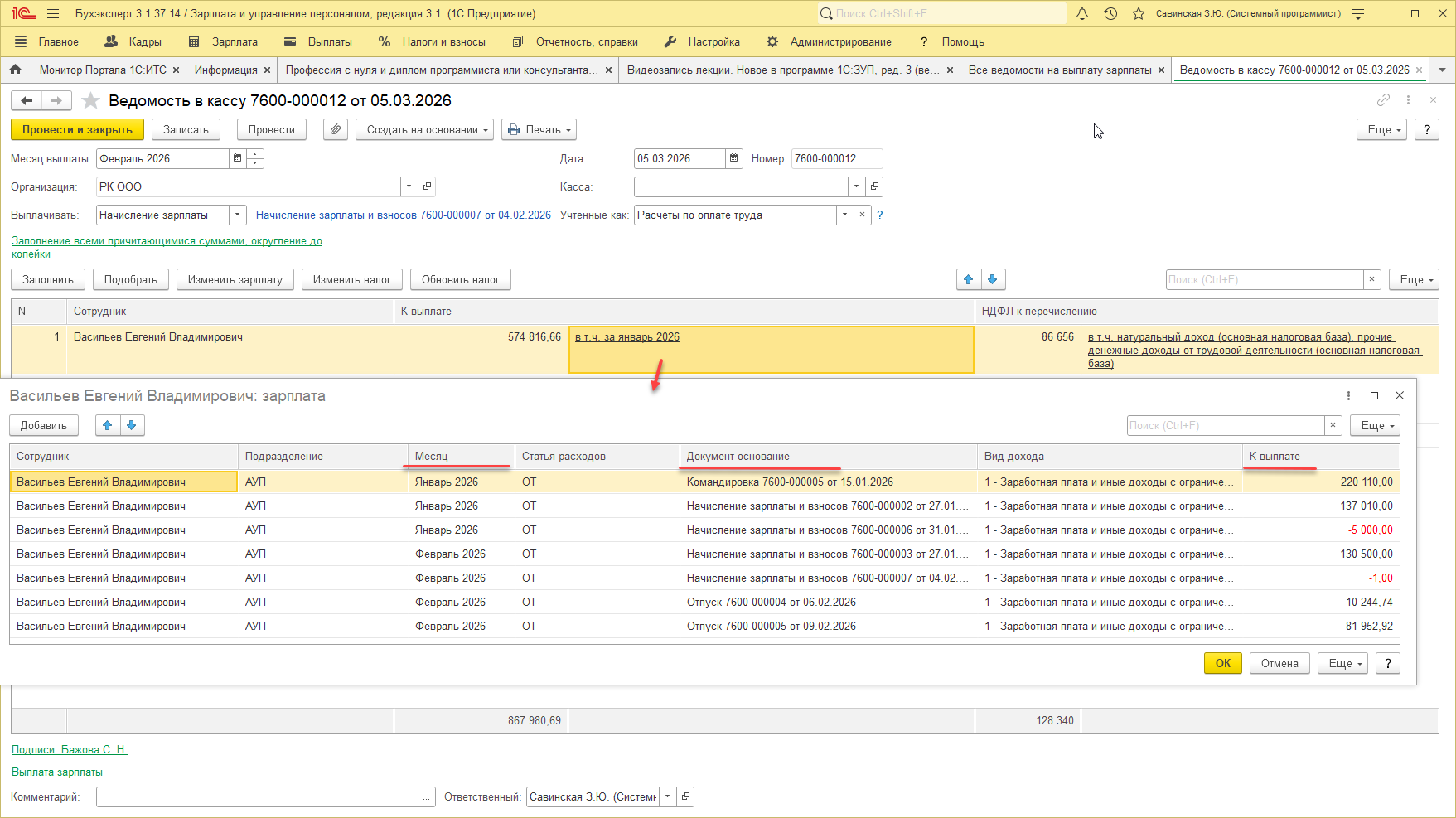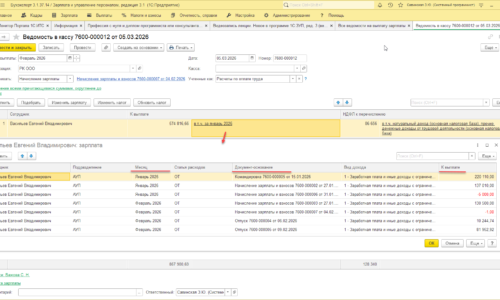 Спасибо за данные. В расшифровке мы видим, что есть 2 строки за декабрь 2025 года. Сумма строк равна 0. Предлагаю удалить эти 2 строки из документа. Важно, что бы сумма к выплате не изменилась. После этого можно сделать еще одну ведомость на выплату за декабрь 2025 года, дата документа 31.12.2025 года и подобрать сотрудника вручную в документ. Это позволит программе сделать корректировку сумм по документам основания в учете 2025 года и не нарушить учет 2026 года.