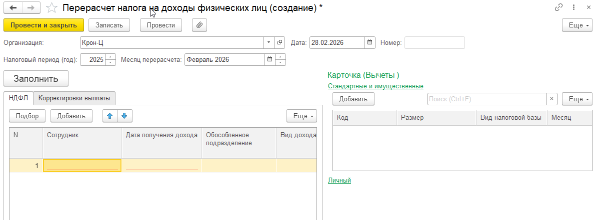 Сейчас в учете верно 2026 год. Но нам нужно исправить 2025 год тоже. Для этого создадим еще один документ Перерасчет ндфл. Налоговый период укажем 2025 год. После этого будет выполнен перерасчет?