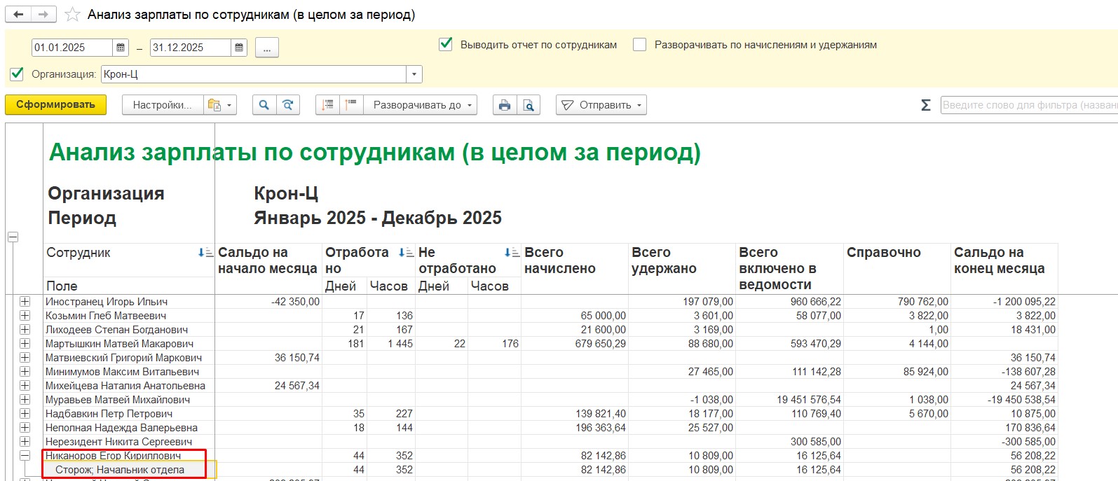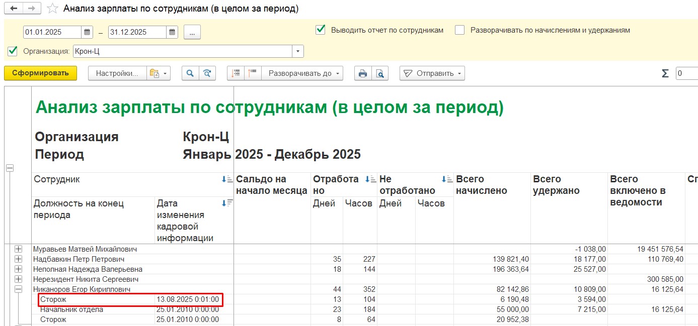 Здравствуйте! Настраиваться отчет «анализ зарплаты по сотрудникам (в целом за период»). В отчет добавляем реквизит должность на конец период. Ожидаем, что информация о начисленной зарплаты соберётся по последней должности на конец заданного периода. Период в отчете сентябрь-октябрь. У сотрудника изменилась должность с 15.10.25. Но при формировании отчета с данными условия, выходит с разбивкой по его должностям, только если сформировать отчет в пределах одного месяца, то сформируется по последней должности. Как сделать, что бы при формировании отчета за несколько месяцев, отчет вывел информацию по последнему месту работы? Во вложении слайды