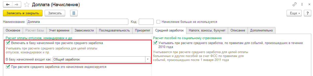 1. Добрый день! Проверьте, пожалуйста, у вновь созданного начисления на закладке Сдельный заработок указано ли, что оно входит в средний?
