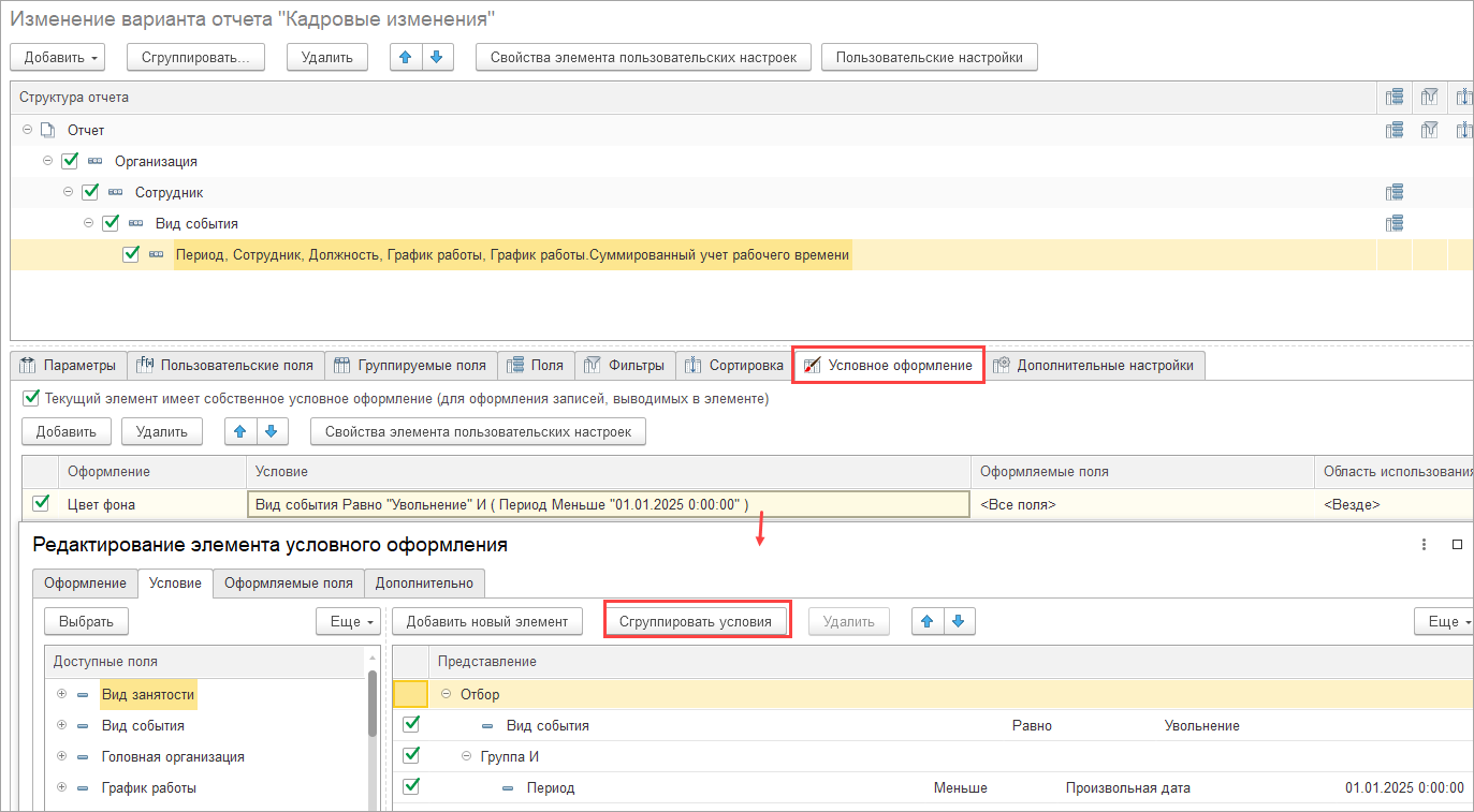 Пробовала настроить отчёт через условные оформление, чтобы сотрудники, уволенные до 01.01.2025, выделялись другим цветом, тоже не получается.