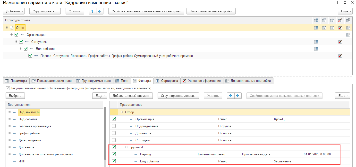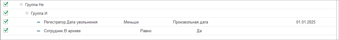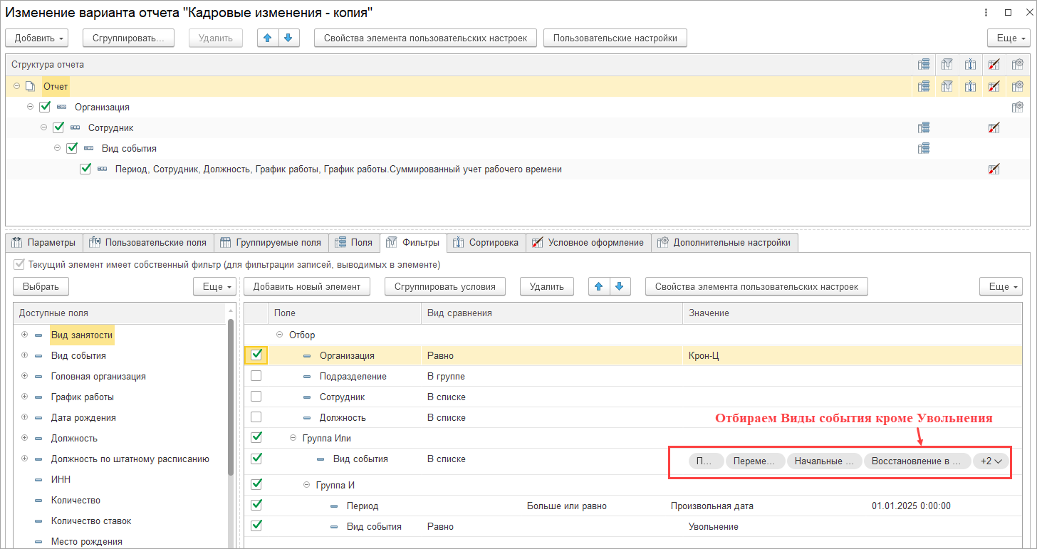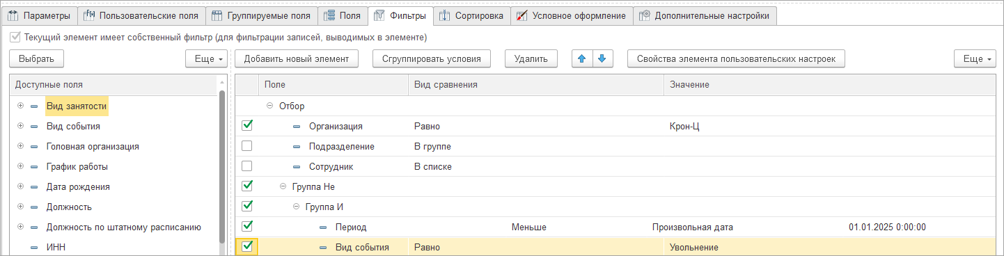 Но у одного сотрудника может быть за отчетный период несколько событий и при таком отборе мы исключаем только событие Увольнение с датой до 01.01.2025, остальные события по сотруднику и сам сотрудник выводятся в отчет.