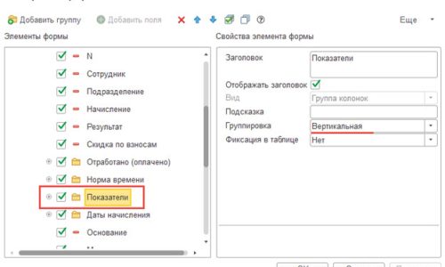 Приложите пожалуйста скриншот документа «Начисление зарплаты и взносов», чтобы были видны показатели, участвующие в расчете Доплаты. Для этого над табличной частью нажмите кнопку с зеленым плюсом (называется «Показать подробности расчетов»). Справа вверху в шапке документа нажмите кнопку Еще — Изменить форму. В открывшейся форме найдите папку «Показатели» и выделите ее. В настройках справа установите Группировку — Вертикальная (скриншот прилагаю). Далее ОК.