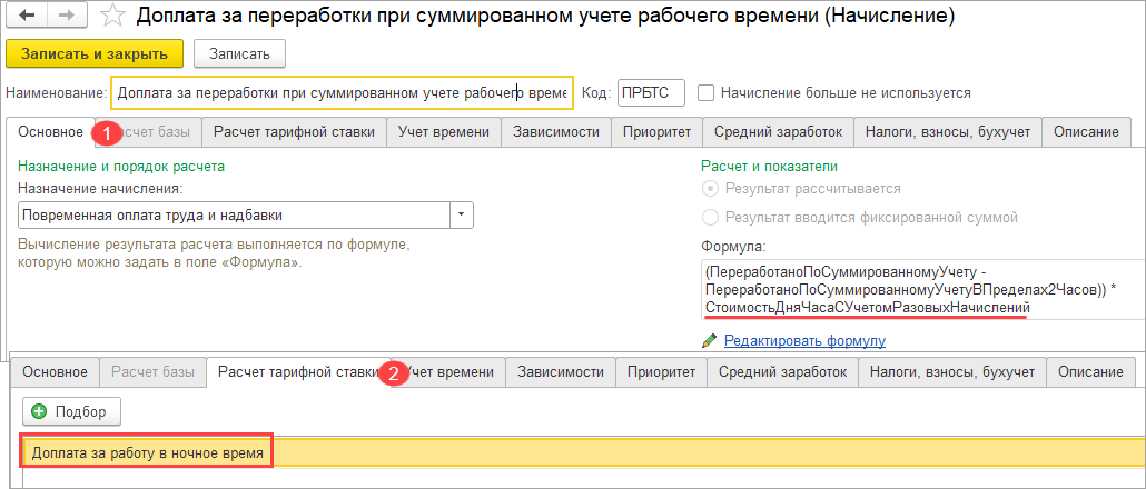 1. Можно для начисления Доплата за переработки в формуле использовать показатель СтоимостьДняЧасаСУчетомРазовыхНачислений. После этого появится возможность на вкладке Расчет тарифной ставки добавить начисление Доплата за работу в ночное время: