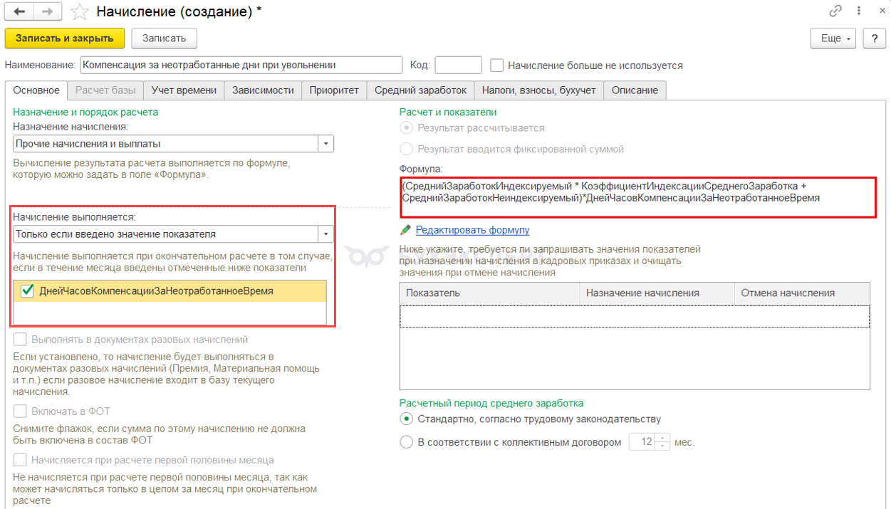3. В приложенной статье предлагаются настройки начисления Компенсация за неотработанные дни при увольнении для которого указываем :