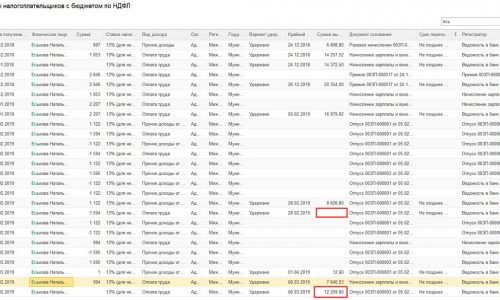 Также приложите пожалуйста скрин содержимого регистра «Расчеты налогоплательщиков с бюджетом по НДФЛ» с отбором по этому сотруднику. Необходимо, чтобы были видны: Период, Дата получения дохода, Сумма, РЕГИСТРАТОР и Сумма выплаченного дохода (через «Ещё — Изменить форму» можно подвинуть колонки, чтобы всё уместилось в один скрин)