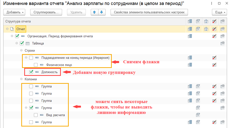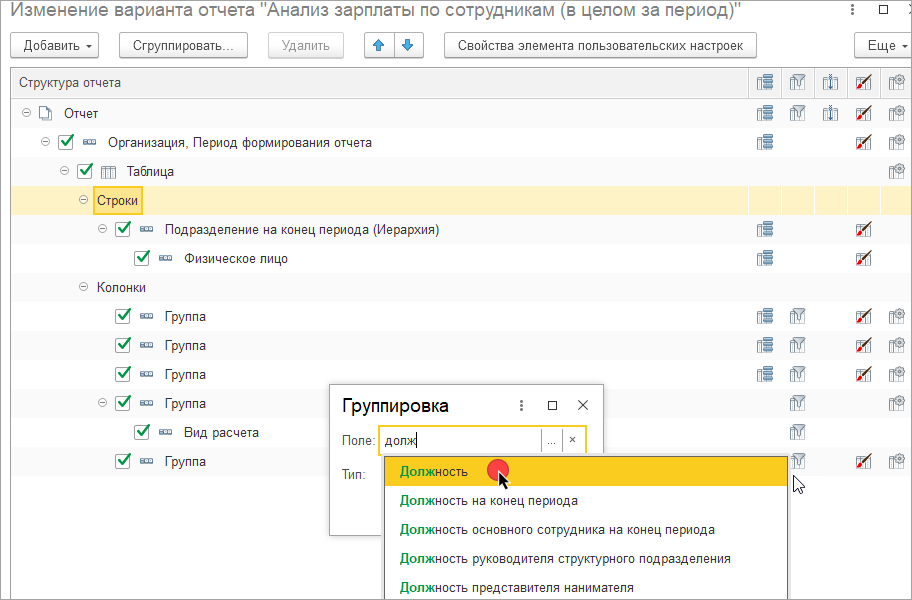 3. Ожидаем, что Должность будет на том же уровне,что и Подразделение (и при этом Должность не должна быть внутри других группировок).