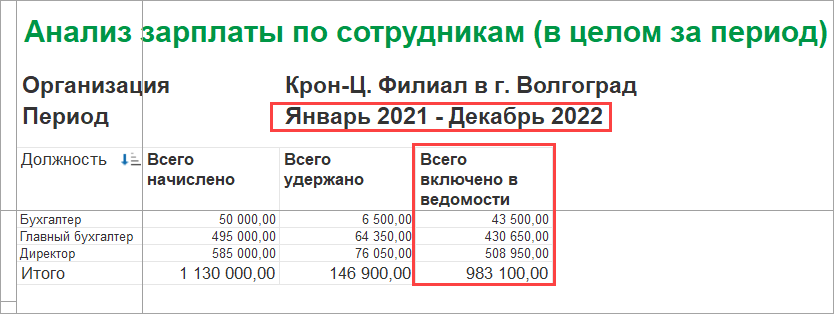 В результате получим отчет за период какая сумма включена в ведомости в разрезе должностей за период, т.е. выплаченные суммы за период по должностям: