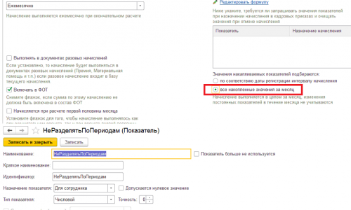 Добрый день! Мне удалось настроить формулу Макс(0,(ДополнительнаяДоплата — РасчетнаяБаза))+ НеРазделятьПоПериодам. Чтобы начисление не разделялось по периодам нужно добавить в формулу накапливаемый показатель НеРазделятьПоПериодам, вводить его значение не нужно, настройки на скриншоте.